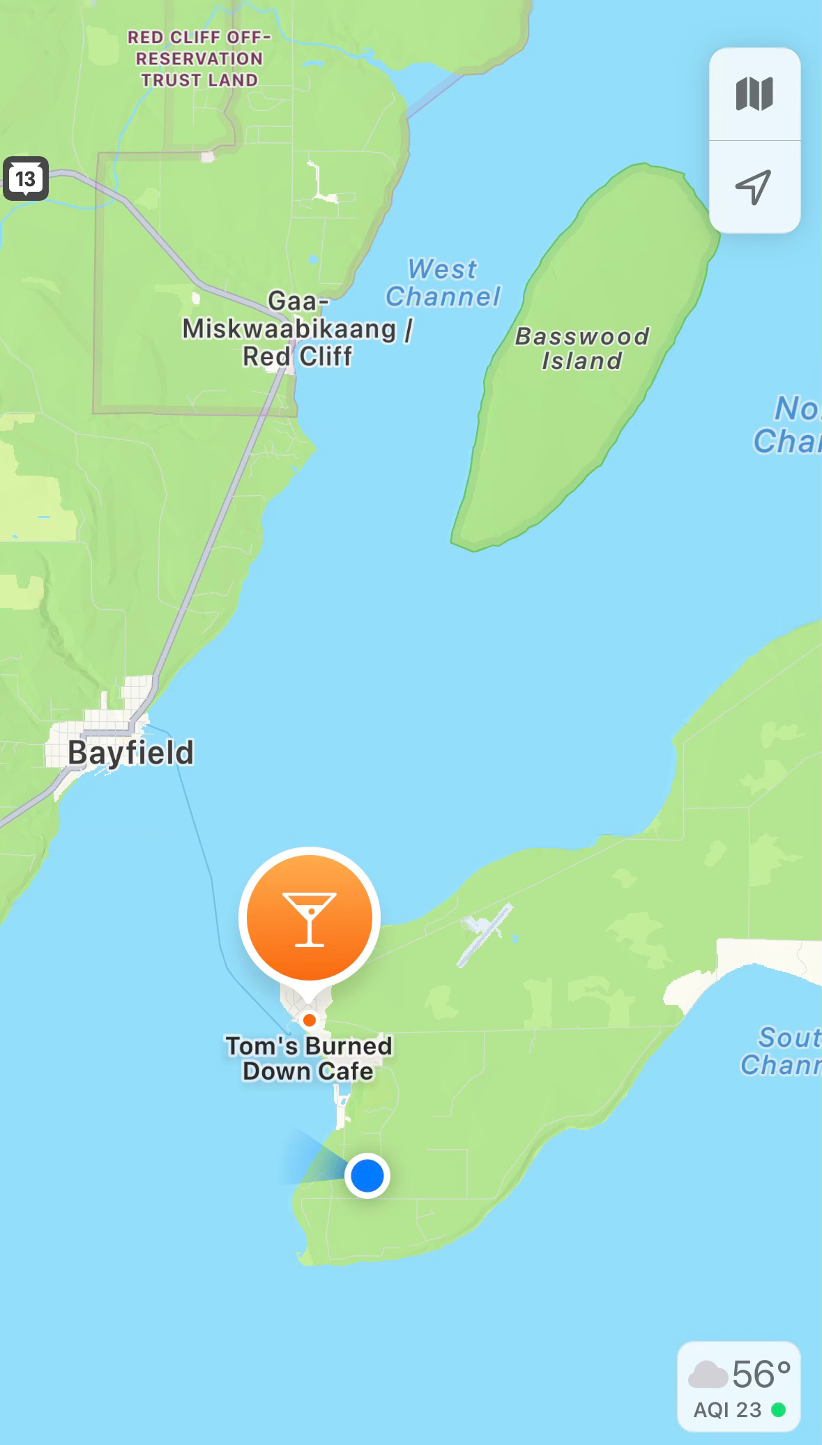 The visitor’s brochure I’d picked up at the Bayfield terminal advertised the island’s many art galleries, wine bars, and kayak rentals. But it was halfway through October, the end of shoulder season, and what remained open for business were two restaurants, a grocery store, and Tom’s Burned Down Cafe.