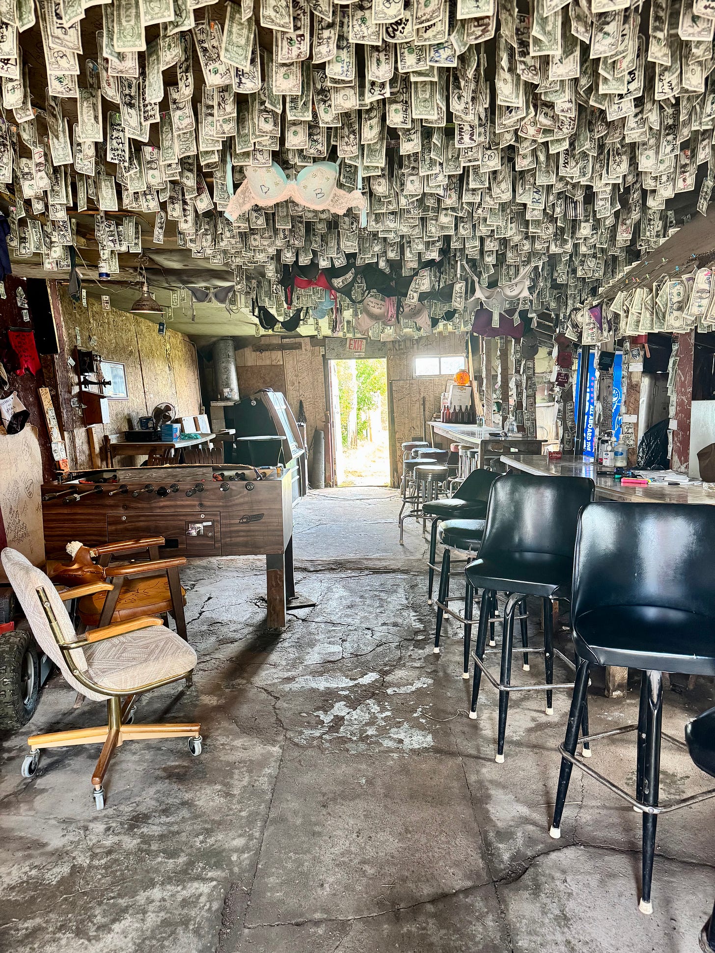 It was mid-July when I arrived in Moquah, the afternoon before the last day of the Lumberjack World Championships. In the dirt parking lot were a handful of Harleys and a mud-splattered UTV with a coonhound panting in the passenger seat. Waving a greeting to the aging bikers pounding Busch cans at the picnic table, I stepped around the errant cinderblocks and inside the Palace walls, which were not made of plywood but even cheaper OSB board, and seemed ready at any moment to collapse in a strong breeze. It took a couple seconds of adjusting to the dimness to take in all the details: a canopy of some 500 dollar bills; walls of worn-in bras and underwear Sharpied with come-ons or warnings (“THE END IS HERE,” “CALL 4 THE RIDE OF UR LIFE”); dozens of empty cans littering the cracked concrete floor. Elsewhere, a broken jukebox, a trash-strewn foosball table, and a man of maybe 75 slumped silently in the corner, looking rather like a frame from an old Tarkovsky film.