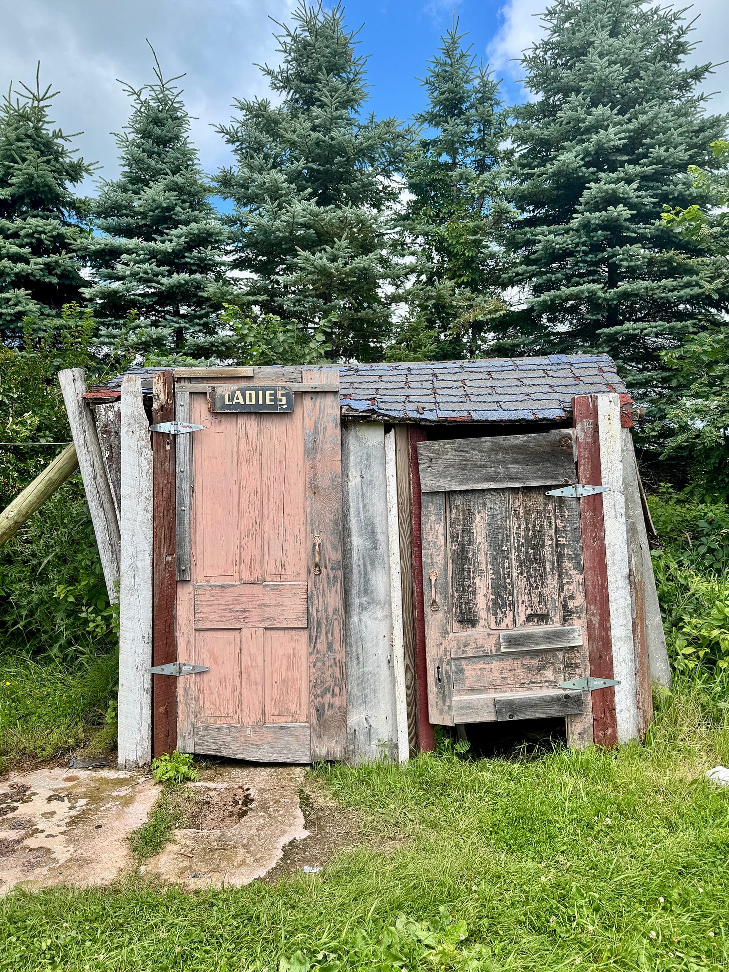 Relenting my interrogation, I scuffed around in painful silence, eyeing the shelves cluttered with burnt-out lightbulbs, ancient tins of cashews, and dozens of yellowed newspapers reporting decades of losses of the Minnesota Vikings, to which Bud had added his own handwritten captions (“CRY-BABY QUEENS,” “CHOKE AGAIN 2017,” “MORE CRYING 2018”). Reviews had stressed that the bathroom should at all costs be avoided, but it was an hour back to Hayward with no rest stops in sight. Out the back and towards the woods, I strode grimly towards the wooden assemblage leaning at an obtuse angle, which unavoidably appeared to be the women’s outhouse. (There is no men’s outhouse at the Plywood Palace; instead, fellas drop trou and commune with the great outdoors.) Inside the dark and tilted hutch was a scene from a horror movie, cobwebbed and swarmed with flies, with an aroma best left to your imagination. Back inside, a new arrival was tormenting Bud with questions. I headed out on Highway G, glad to have come and gladder to leave.
