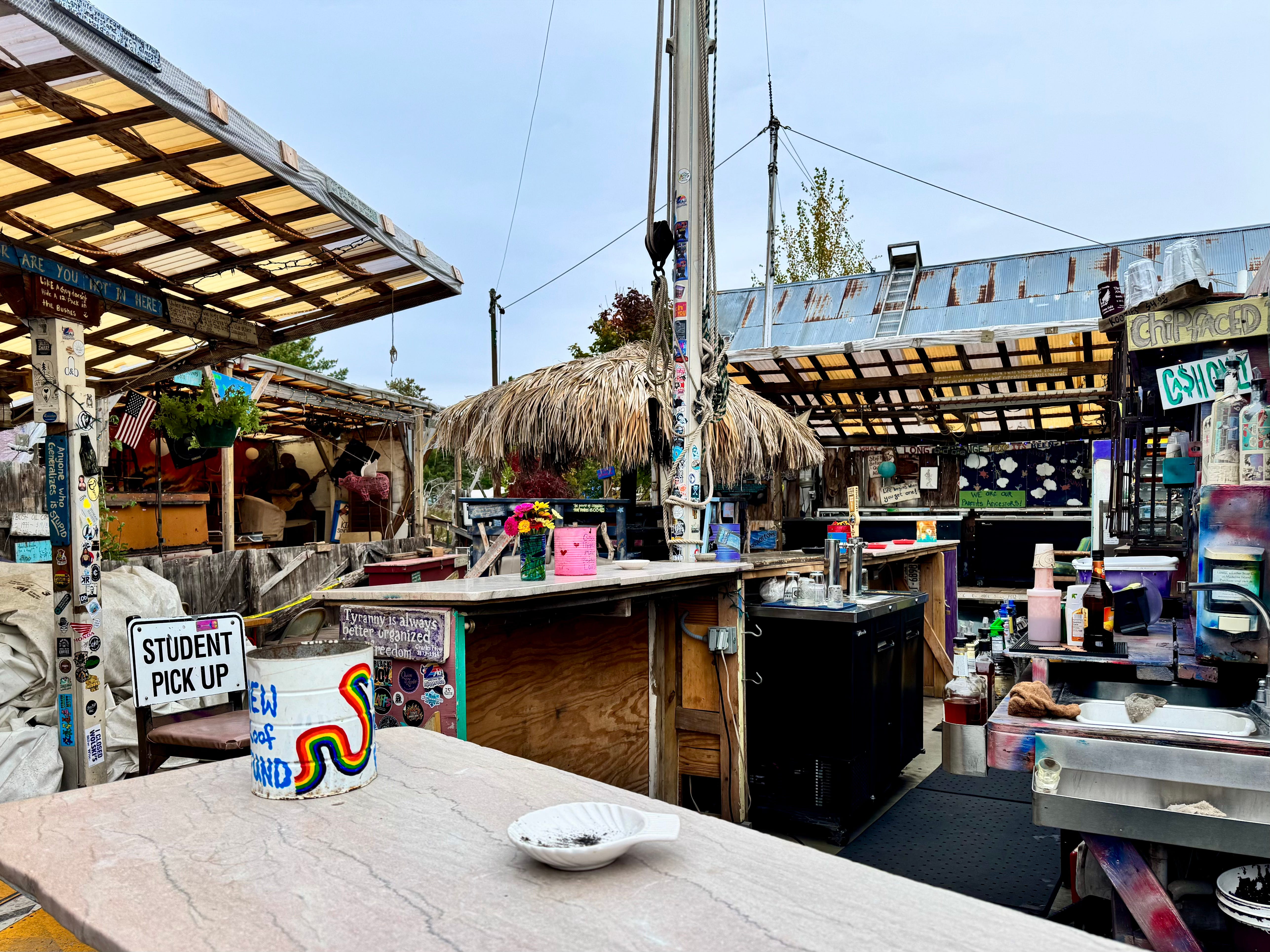 One could be tempted to make assumptions about the ideological spirit of a remote island dive bar in the far north of Wisconsin. (An F-150 parked beside me on the ferry had decorated its rear windshield with a decal symbolizing their family as two parent-sized assault rifles and three child-sized Glock 17s.) Those people might be surprised to notice “BLACK LIVES MATTER” painted large enough outside of Tom’s to be seen from satellite, or the Palestinian and rainbow flags flapping in the breeze, or to hear the songs requested from the place’s rowdy regulars. “I wanna hear some SWV right now!! Let’s GOOOO!!” hollered a shaggy fellow who had climbed behind the bar, now gyrating under a sign that read “LET’S MAKE GETTING IN TROUBLE FUN AGAIN!” The bartender’s earrings dangled as he poured the bar a round of shots requested by the hippies — equal parts Blanco, Reposado, and pickle juice, which wasn’t nearly as disgusting as it seemed. No one seemed to notice that it had begun to rain as the tourists and regulars danced and chain-smoked to the sounds of Whitney Houston, Ludacris, and “Brandy (You’re a Fine Girl).”