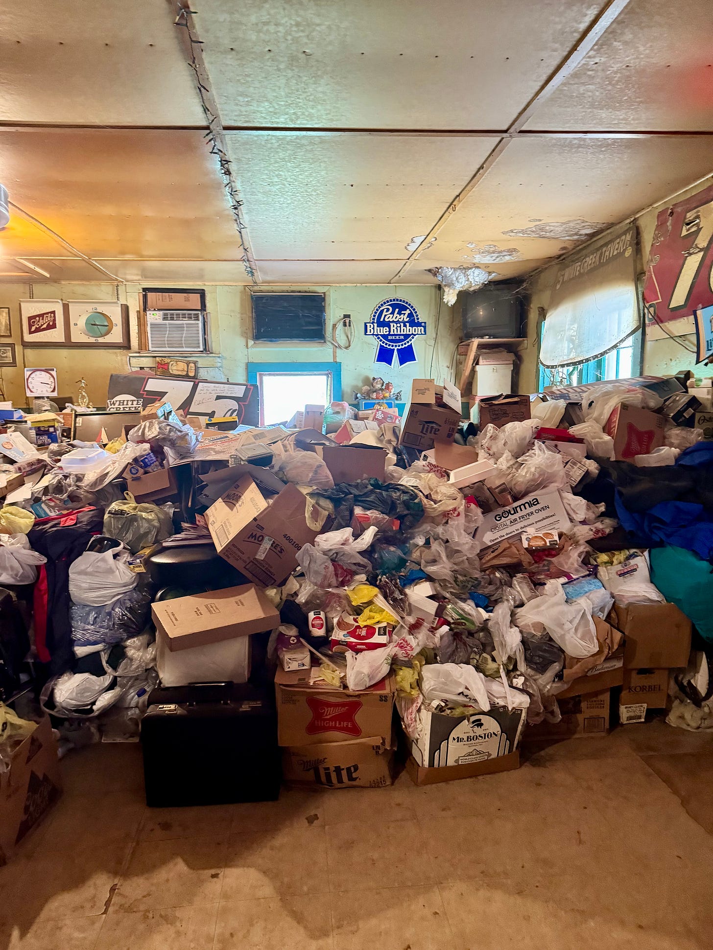 I’d been told by the bartender of the nearby Famous Garage Bar to ask Meryl at the White Creek about her photo albums. “Tell her Tracy says hello,” she said, then added optimistically: “It’s not too hot today, so the smell won’t be too bad.” Still run, if not quite maintained, by the Smith’s three children, the White Creek Tavern claims the oldest family-owned liquor license in the state; Meryl, the only daughter, wasn’t said to be a talker, but knew more about White Creek’s history than anyone in the county. From the empty parking lot, the place seemed dubiously open, but I entered anyway just after 3 pm. The smell hit me immediately — sour, ancient, and borderline fleshy, like an animal was decomposing somewhere just out of sight. Stacked, just like the pictures, shoulder-height and wall-to-wall were mounds of decades-old juice cartons, styrofoam takeout containers, brimming garbage bags; behind them, a mid-century Schlitz clock (somehow still working) and a poster commemorating the bar’s 75th anniversary in 2008. Sitting behind what remained of the bar, which had space for three stools where photos once showed seven, was an unsmiling, gray-haired woman, apparently astonished to see anyone at all. I passed on Tracy’s greeting, but her expression didn’t change. “I don’t know anyone from the Garage Bar,” she insisted. “I don’t leave town hardly at all.”