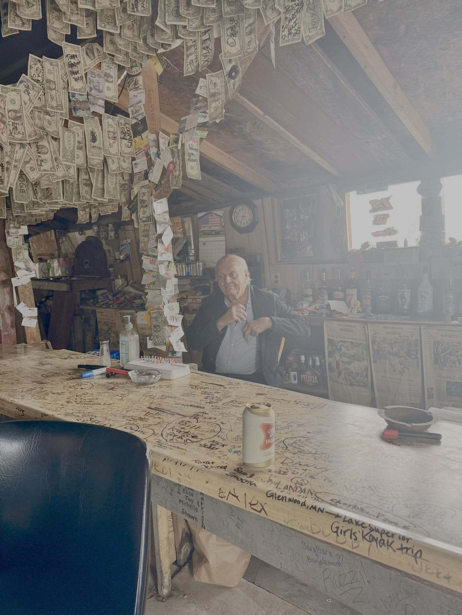 “Hi!” I squawked to the old man, who grunted softly back. Avoiding ice and glassware, I ordered a can of High Life; in the absence of running water, or so I had been told, Bud would bring a water bucket from home with which to “wash” the dishes, which he’d dry on his shirt. This had been going on for roughly 50 years now, though these days the Plywood was only open 16 hours a week (Friday and Saturday afternoons til roughly 9 pm). “How long have you owned the place?” I asked, having heard through the grapevine that Bud had inherited his father’s bar after it burned down. “1975,” he muttered, staring miserably past me. “You stay open through the winter?” I wondered, examining the uninsulated walls. “Yep,” he answered curtly. “What do you do for heat?” I pressed on, our “conversation” now feeling tantamount to elder abuse. Bud pointed a shaky finger towards a space heater in the corner. “Heater,” he grumbled, beaming a clear-cut psychic message for me to kindly scram.